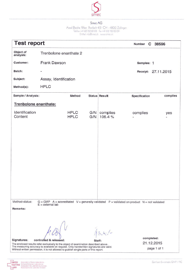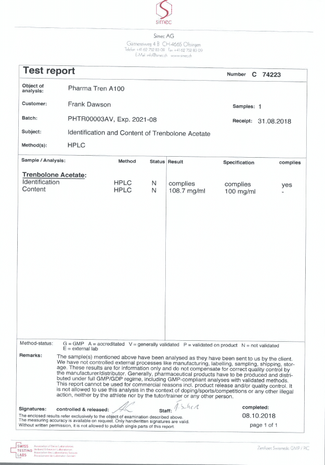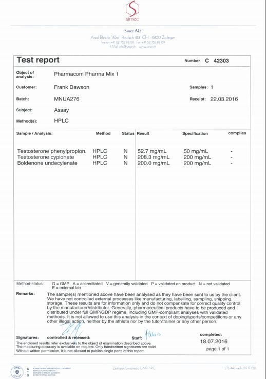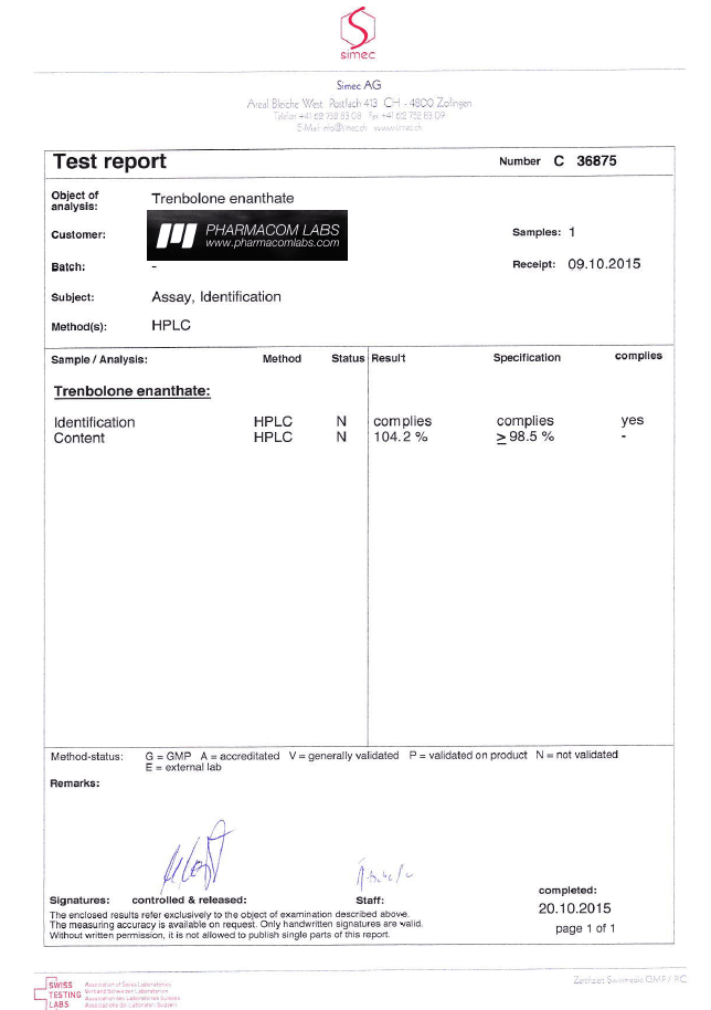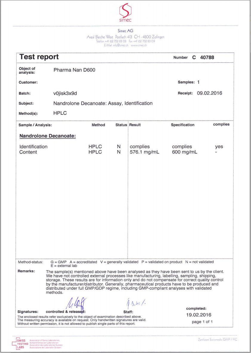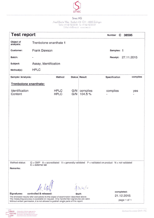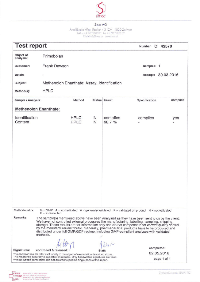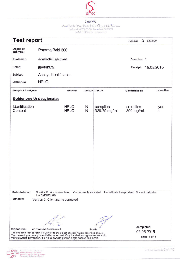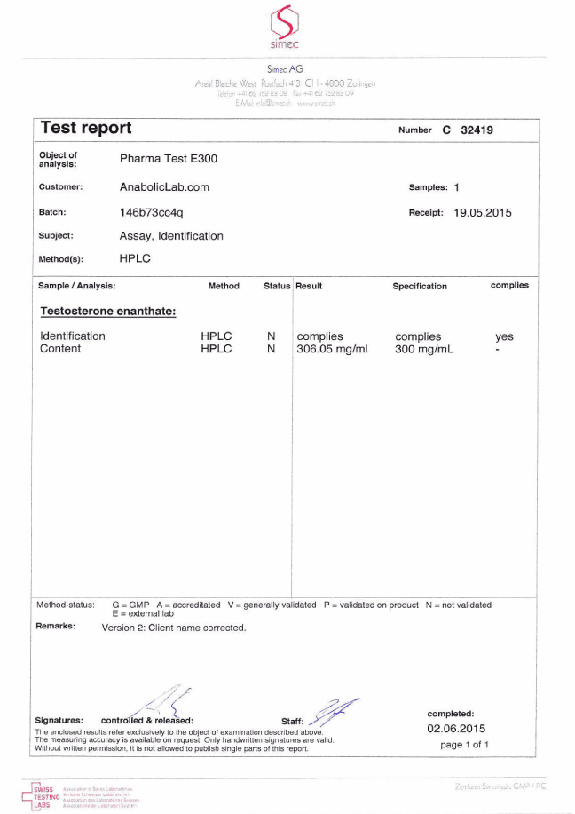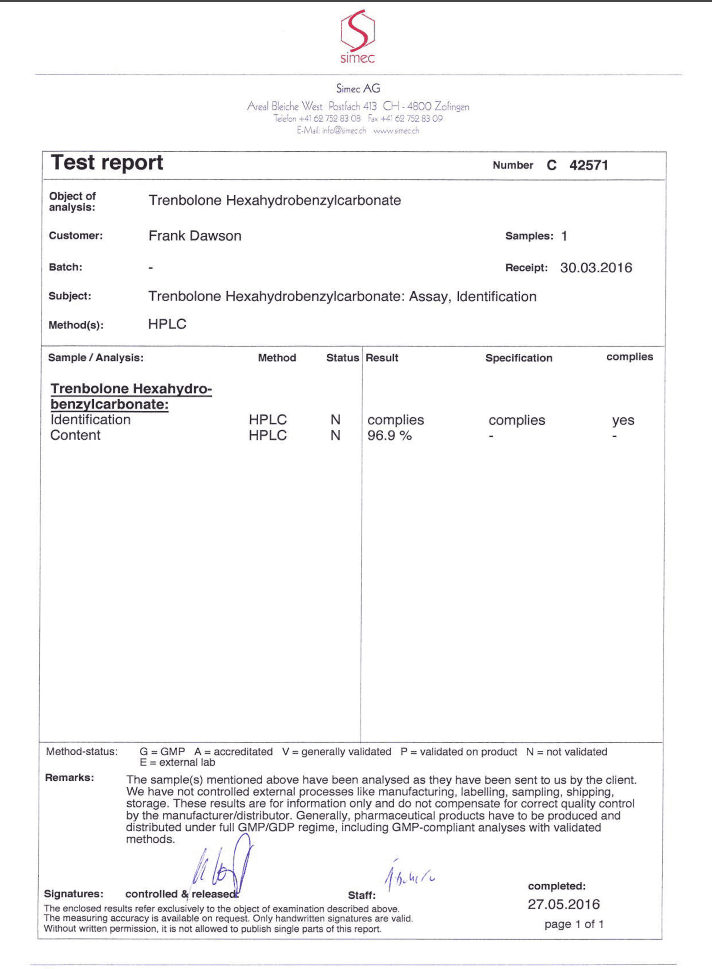 All chromotography tests have been performed by an independent GMP-certified accredited lab Simec AG (www.simec.ch). All results are verifiable! Each report contains its individual number; for example C34804 for Boldenone Undecylenate. You can at any moment directly contact Simec and provide particular report number to verify the authenticity of the report.