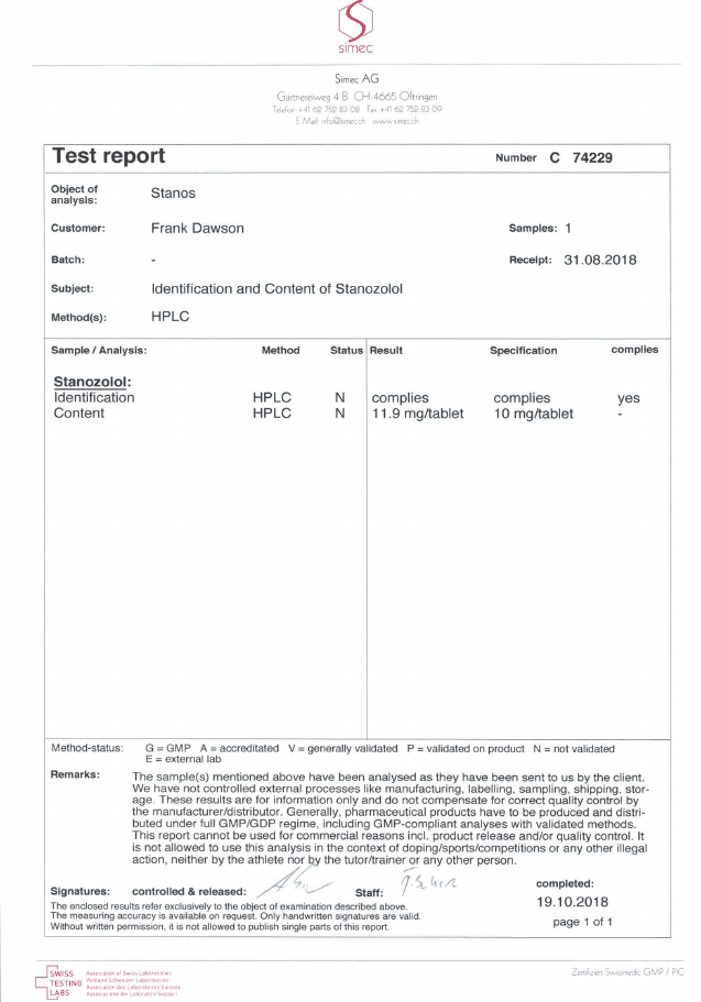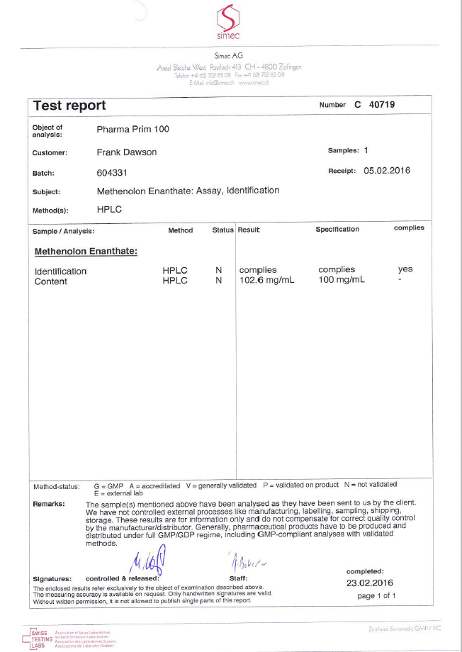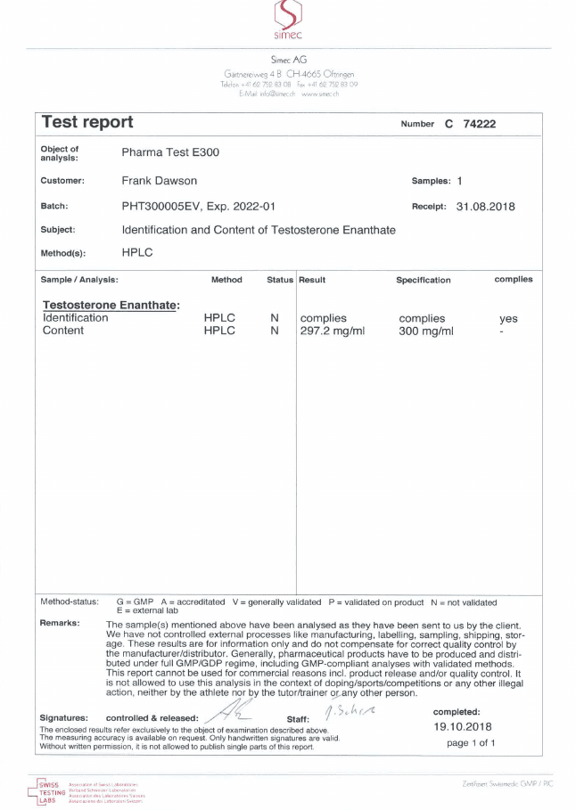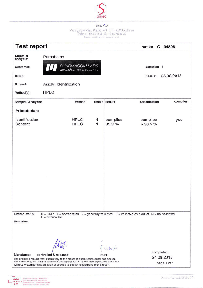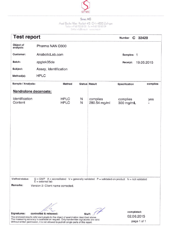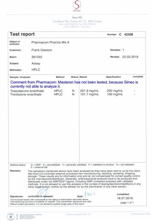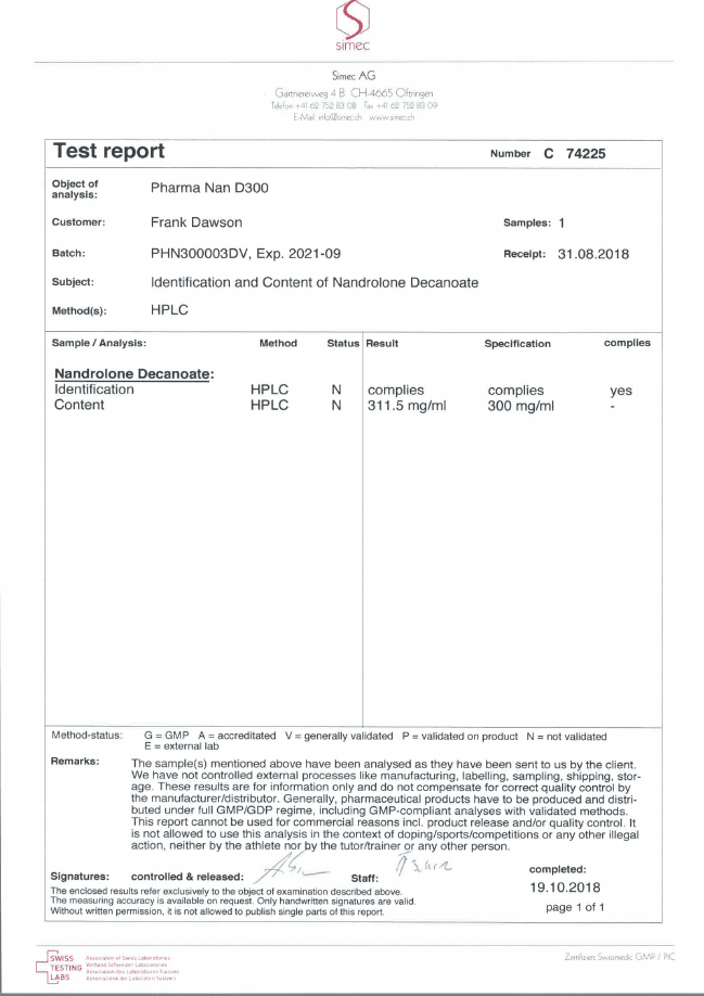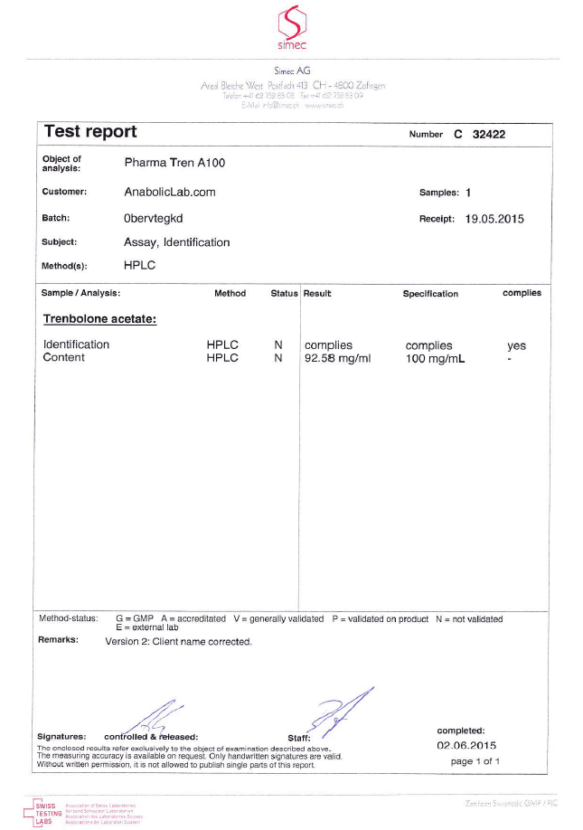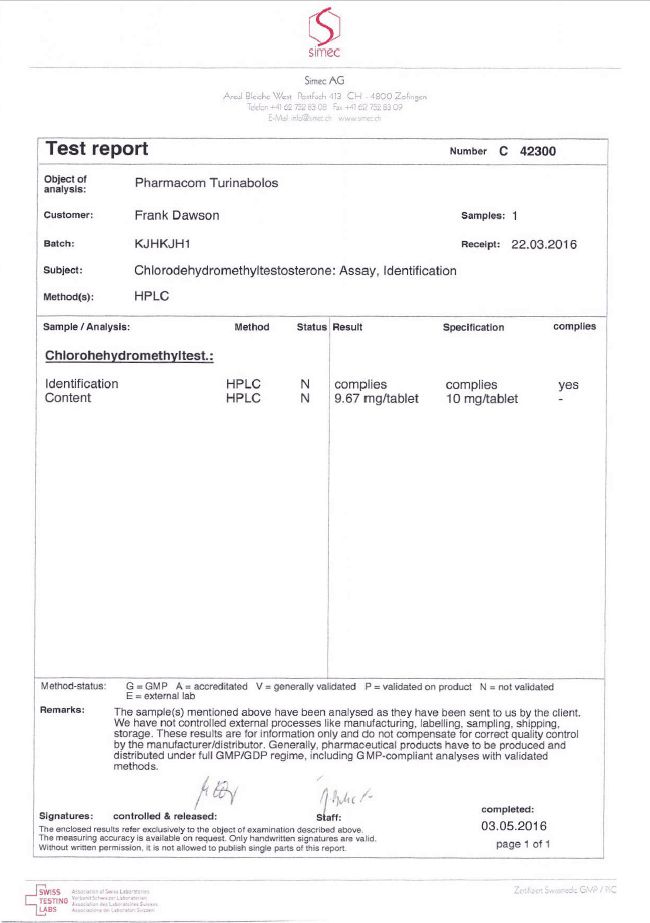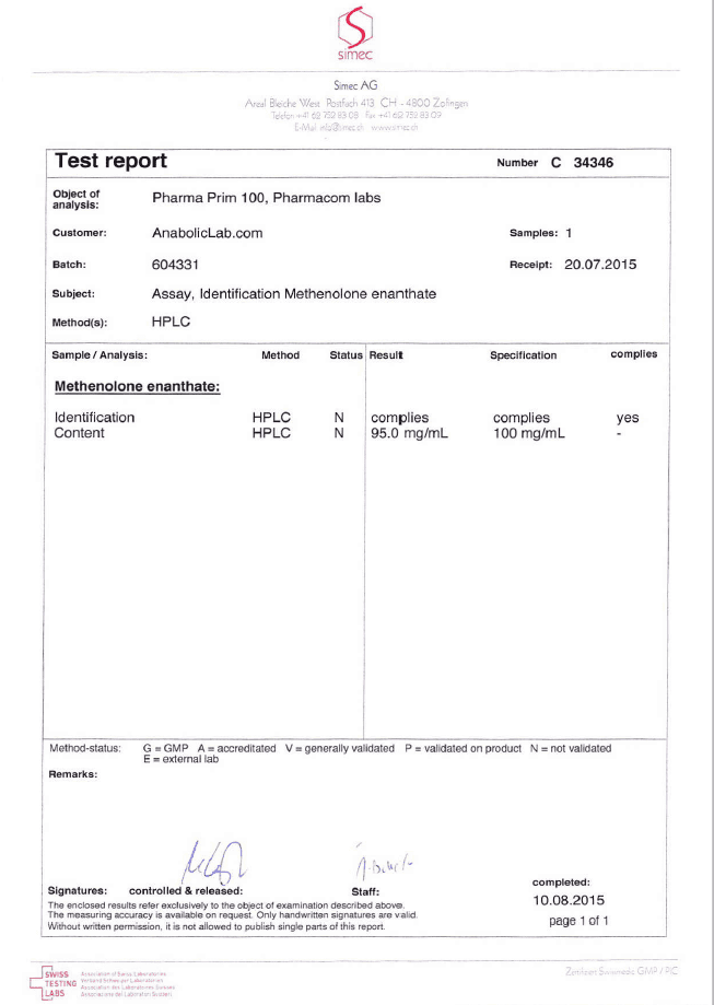 All chromotography tests have been performed by an independent GMP-certified accredited lab Simec AG (www.simec.ch). All results are verifiable! Each report contains its individual number; for example C34804 for Boldenone Undecylenate. You can at any moment directly contact Simec and provide particular report number to verify the authenticity of the report.