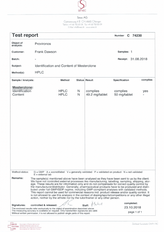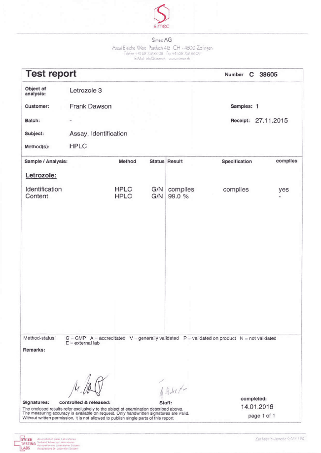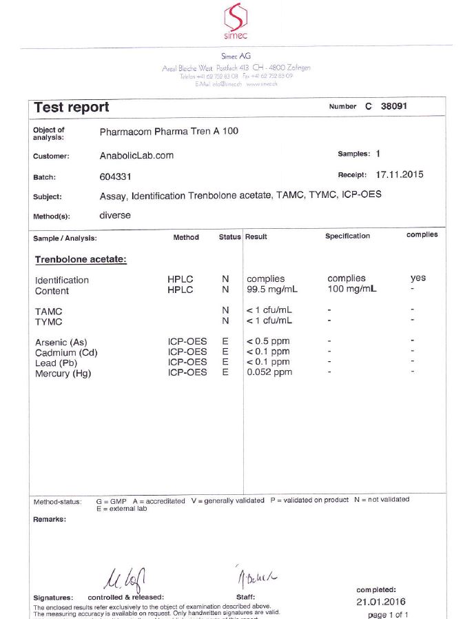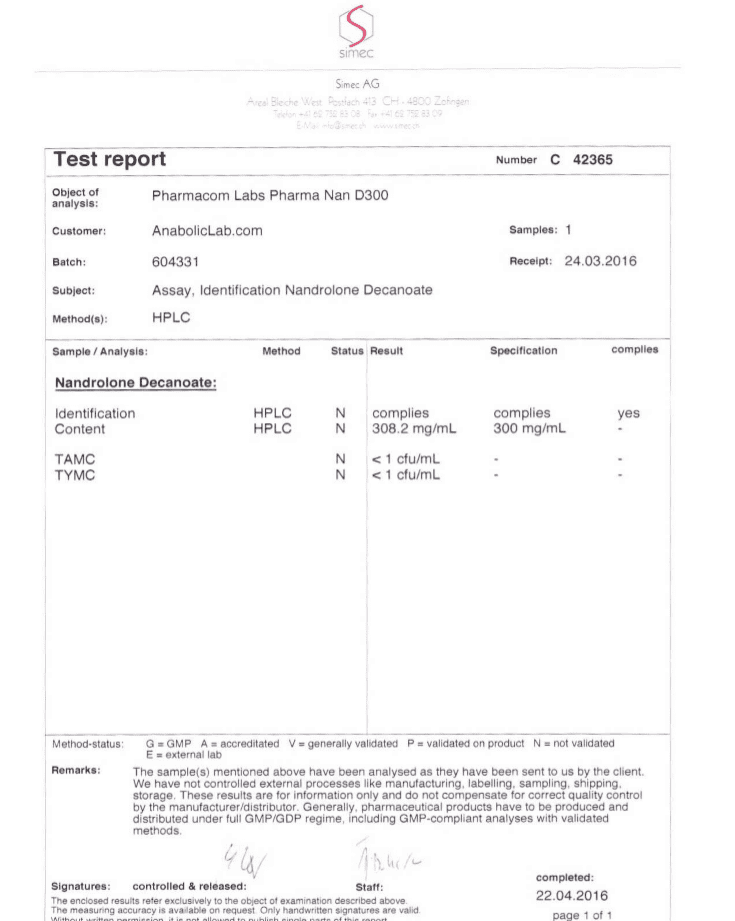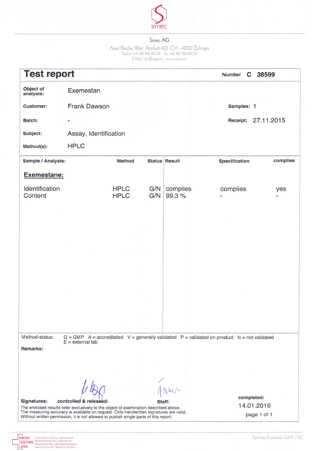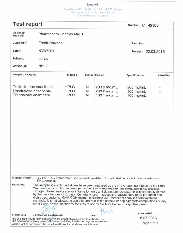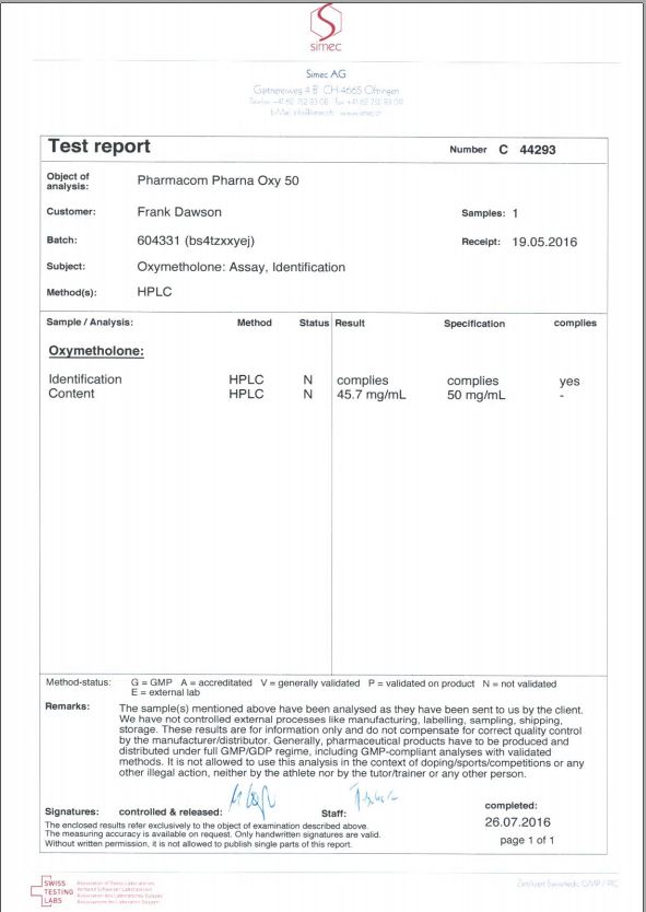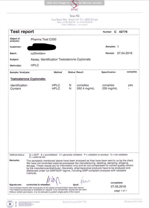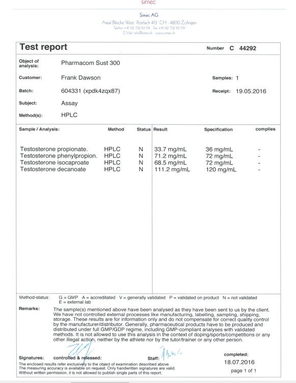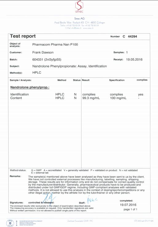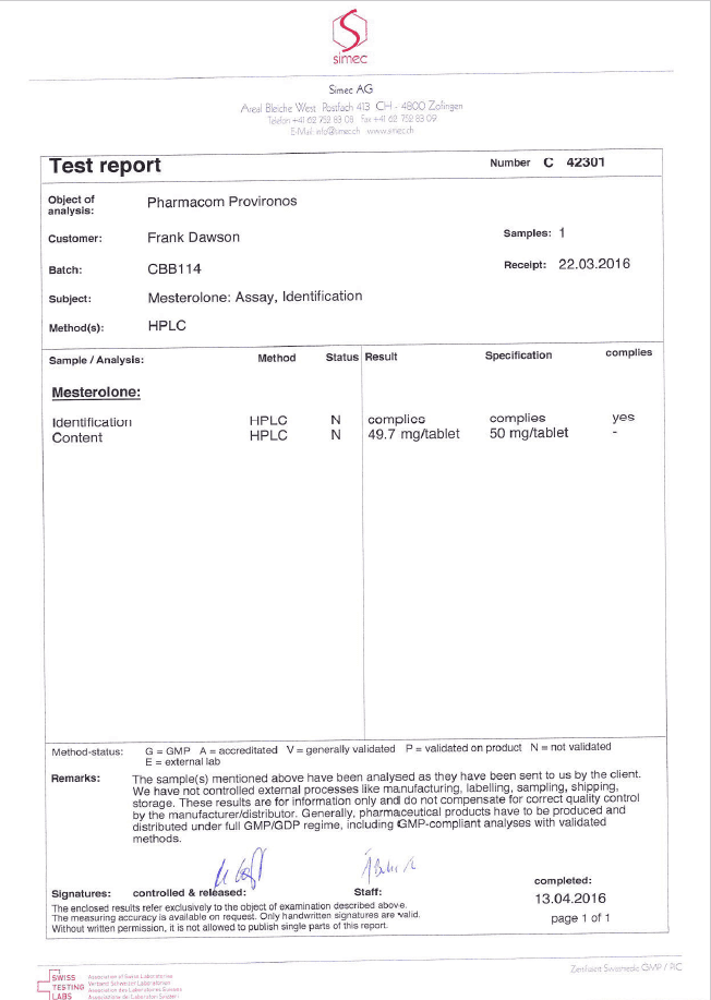All chromotography tests have been performed by an independent GMP-certified accredited lab Simec AG (www.simec.ch). All results are verifiable! Each report contains its individual number; for example C34804 for Boldenone Undecylenate. You can at any moment directly contact Simec and provide particular report number to verify the authenticity of the report.