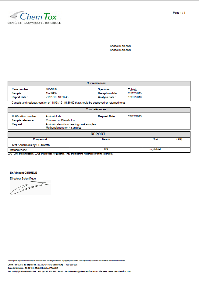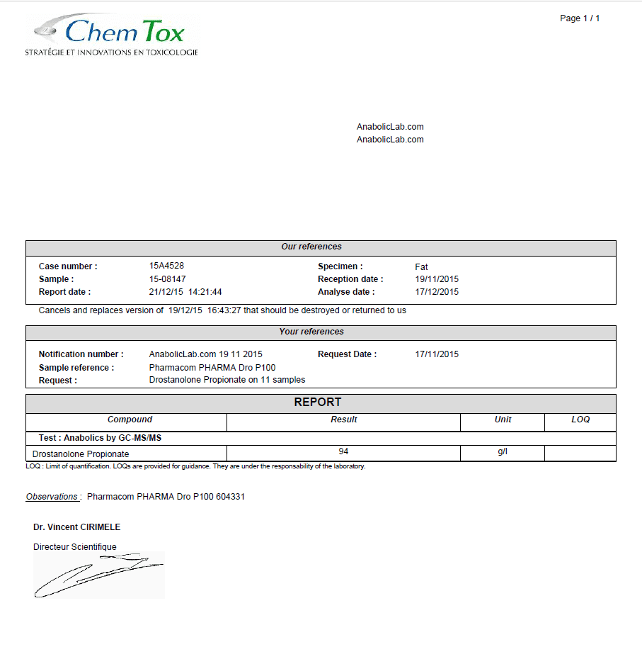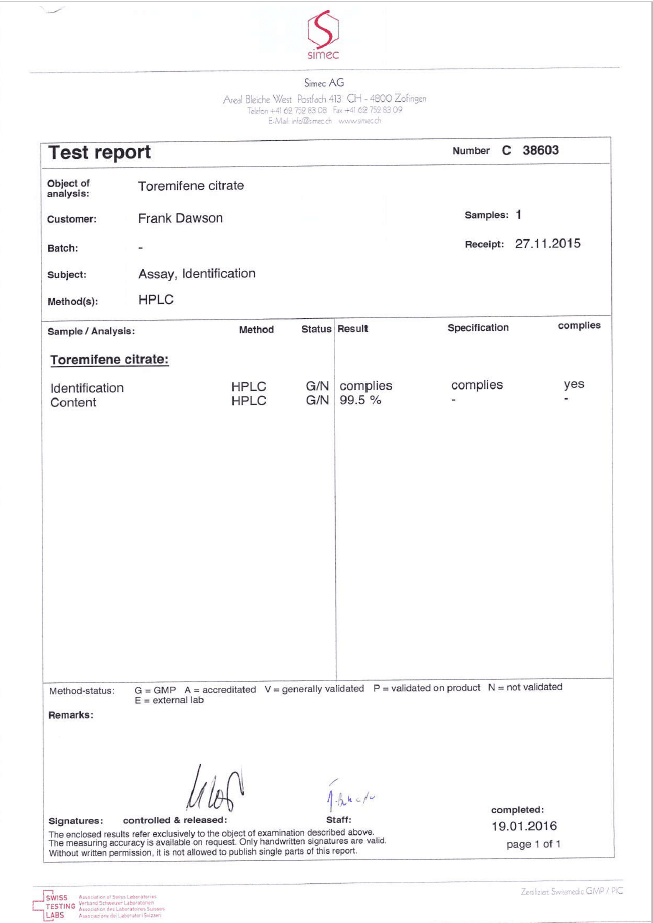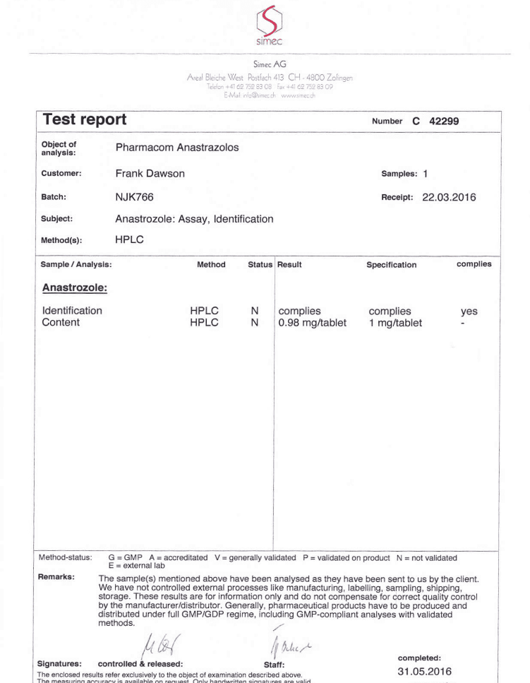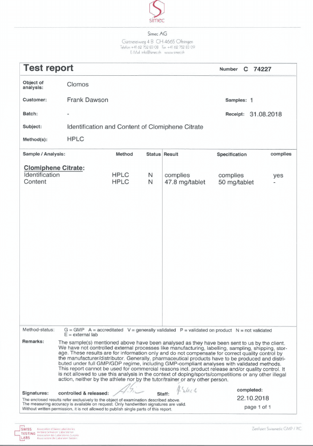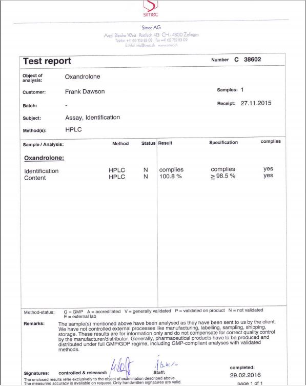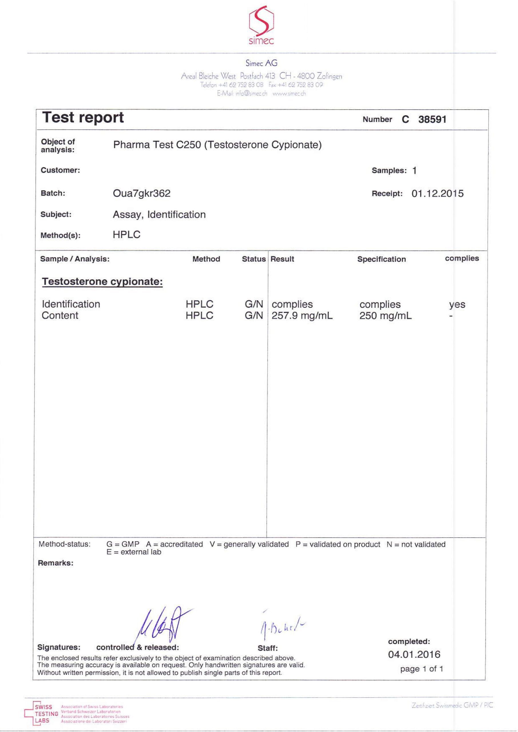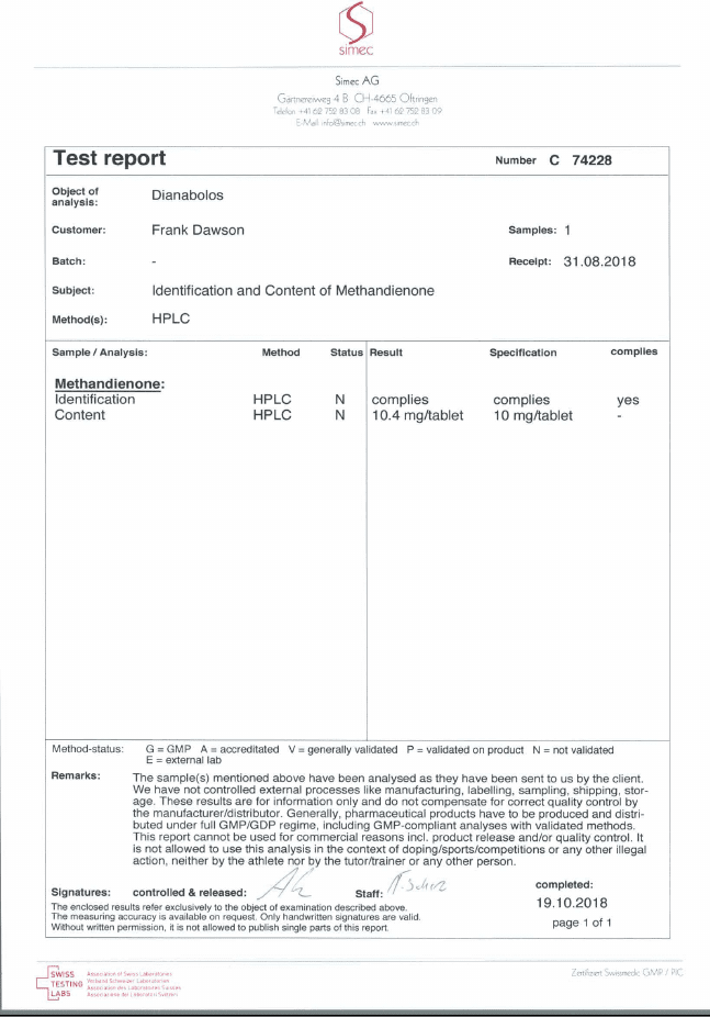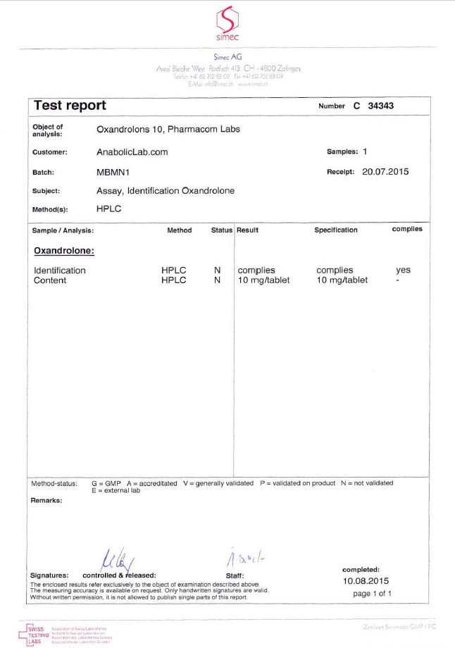 All chromotography tests have been performed by an independent GMP-certified accredited lab Simec AG (www.simec.ch). All results are verifiable! Each report contains its individual number; for example C34804 for Boldenone Undecylenate. You can at any moment directly contact Simec and provide particular report number to verify the authenticity of the report.